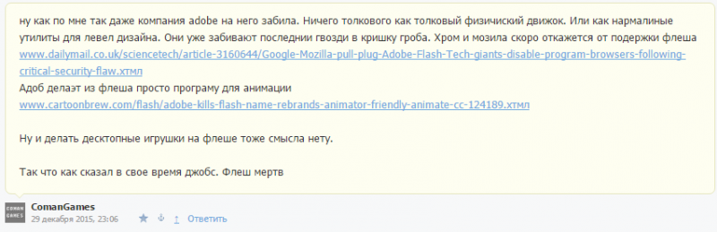 - То, что большинство разработчиков не этом блоге использует Flash, не делает меня неправым, а мою статью оскорбительной (Ребят, бросьте, на devgame всё больше Unity и UE4 проектов и всё меньше Flash проектов. Мы ведь все разработчики здесь, и каждый из нас уверен, что его платформа лучше. Но в то же время всем ведь хочется обсуждать и узнавать новое о других платформах и о проектах на этих платформах. Раньше тут было много обучающих материалов по Flash и минимум материла по Unity и UE4, несмотря на изменение тенденции. 90% постов про проекты на Flash. В то же время 90% инди-игр за последний год написаны не на Flash. Пришло время затрагивать те темы, которые привлекут новых разработчиков, а не только порадуют старых. Мы ведь здесь ради игровой вспышки а не Flash’а)