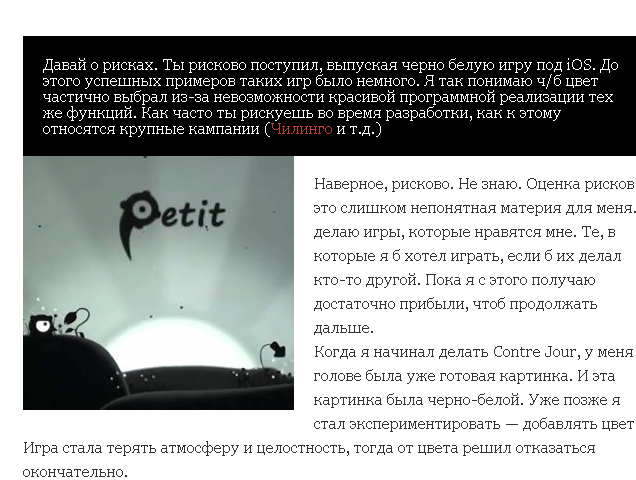 Давай о рисках. Ты рисково поступил, выпуская черно белую игру под iOS. До этого успешных примеров таких игр было немного. Я так понимаю ч/б цвет частично выбрал из-за невозможности красивой программной реализации тех же функций. Как часто ты рискуешь во время разработки, как к этому относятся крупные кампании (Чилинго и т.д.)