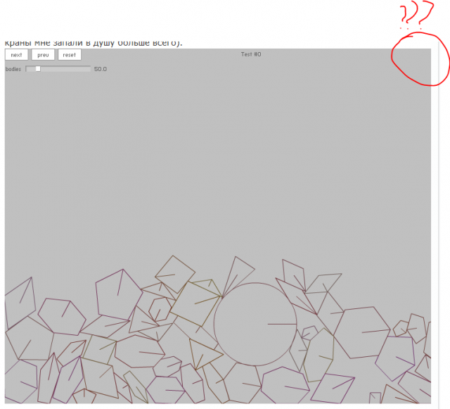 }Думаю, пояснять каждую строчку не нужно. Чтобы создать тест, нужно создать класс, унаследовав его от Test. В конструкторе можно создать всякие тела, метод update вызывается каждый кадр, метод createUI служит для создания всяких кнопочек и слайдеров (я использовал библиотеку MinimalComps.)