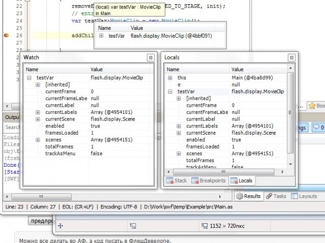 - Работает debug. Удивительная вещь! Раньше у меня отладка сводилась к применению trace, а теперь можно делать полноценную отладку! В случаях ошибки также Flash Develop переключается на отладку и останавливает работу на строке с ошибкой.