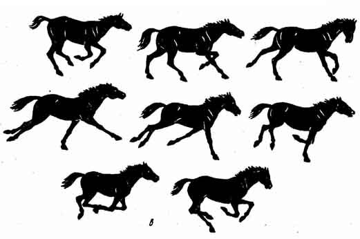 + Интересный доклад получился. У лошади, если упразднять берцовую кость (которая отмечена зеленым треугольником), то «коленки» на задних ногах должны сгибатся наружу, это хорошо видно на раскадровке галопа: