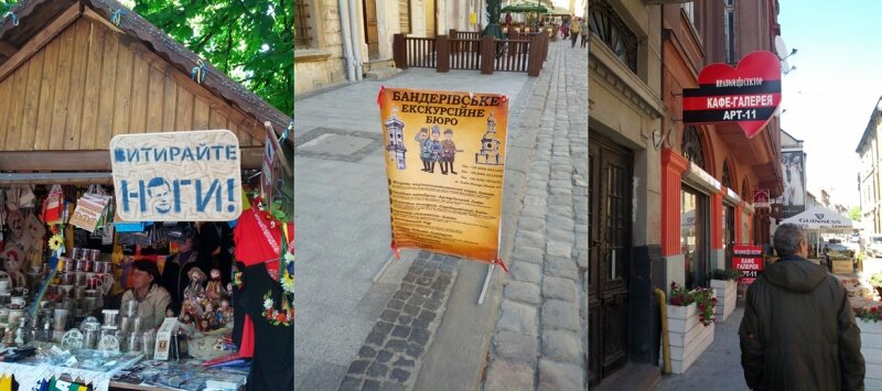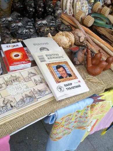 Больше всего позабавило как они обыгрывают ситуацию со зверствами западенцев. Ковры для ног с лицами Путина и Януковича, туалетная бумага с Януковичем и его предвыборным лозунгом «почувствую каждого», кафе-арт галерея «Правый сектор» (не оче на самом деле), бандеровские экскурсионные бюро, визитки Яроша, визитки Яроша, визитки Яроша всем.