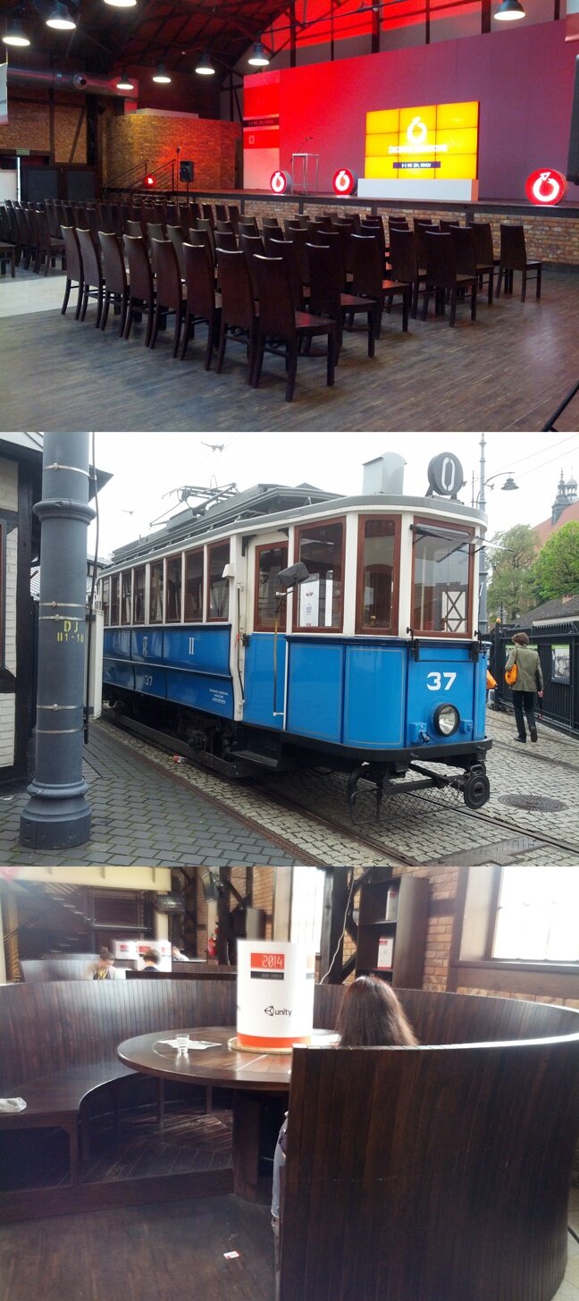 Начнем с места. Это громадная пивоварня. Огромное количество места + очень удобные места для посиделок и естественно расположенные длинные бары. А главное — ламповая уютная атмосфера. Просто представьте себе лощеную кирпичную кладку, дугообразные потолки из дерева, большие витражи. По-моему офигенно. А через дорогу был музей трамваев. И в нем тоже проходил DD. Настоящий музей трамваев!