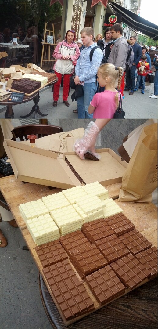 Чтобы не растягивать пост, скажу, что на обратном пути я тоже ехал через Львов. Большую часть времени я прокрастинировал в мастерской шоколада. Это серия кафешек, по всей Украине, которая меня жутко радует как интерьером/подходом так и самим шоколадом. Его очень много и он офигенный. Я уселся на кресле груше в форме кофейного мешка, возле розетки и медитировал с чашкой латте. За это время меня разок угостили бесплатным мятным чаем и еще рассказали лайфхак для любителей шоколада. Каждые выходные они выделяют 15 минут, в которые продают шоколад в два раза дешевле обычной цены. Я вышел на улицу за 10 минут до этого празднества живота и попал в огромную очередь. Но должен признаться она стоило того. шоколад за 10 грн ~ 0.85$ плитка; очень годный, купил 24 плитки.