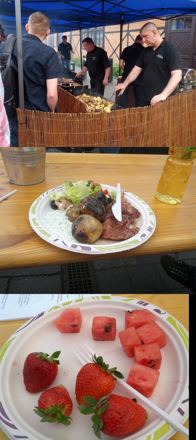 В перерывах как спикеру мне предлагался ланч, который был просто офигенским. Из-за низких цен на еду в Польше, они разгулялись на полную катушку. В первый день конфы были огромные бургеры с начинкой на выбор, клубника, арбузы и еще какие-то сладости. Во второй была семга на гриле, отбивные, запеченная картошка, салаты и просто куча соусов. Ну и плюс ко всему это все происходило на воздухе, можно было покушать в шезлонге или под тентом, что просто шикарно. Кстати еду как в СССР получать нужно было по талончикам, где отмечали, что ты взял.