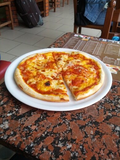 Когда возвращался назад, зашел перекусить в пиццерию у вокзала т.к. не было мака. Моя любимая пицца «Маргарита» в кафе у вокзала 10 грн. Вот такие дела.