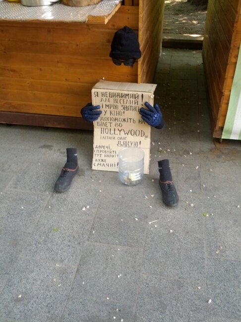 перевод: " я невидимый, но веселый и мечтаю сняться в кино. Помогите на билет в Голливуд и летнюю одежду, спасибо. Кстати, попробуйте напитки, очень вкусные".