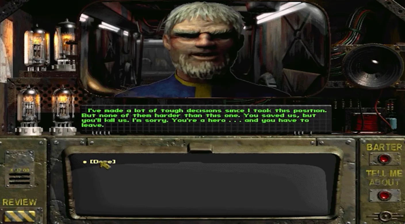 Однако в работу вмешался арт-директор Леонард Боярский. Именно он предложил вариант, который в итоге стал каноничным: изгнание героя, несмотря на его подвиги. Кейн признался, что поначалу сомневался, но в итоге был убеждён коллегами. Сейчас, спустя почти 30 лет после релиза, разработчик отмечает, что не жалеет о сделанном выборе: финал с изгнанием идеально отражал атмосферу мира Fallout, где нет настоящих победителей — только проигравшие или те, кто потерял меньше других.