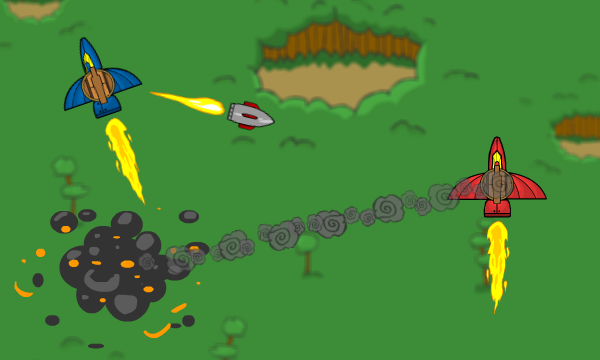 Вдохновение я черпал, из популярной в свое время, досовской «Chopper Duel» (надеюсь, многие помнят эту игру). Здесь, вместо вертолета, вы получаете в свое распоряжение реактивный самолет и вид сверху, вместо вида сбоку. Задача игрока, так же одержать 10 побед, уклоняясь от вражеских ракет, пролетая между препятствиями, стараясь подбить самолет противника и при этом не быть подбитым самому, конечно. Самолеты движутся вперед с постоянной скоростью (можно использовать ускорение), на пути встречаются препятствия — острова парящие в воздухе с помощью неведомой магии. Столкновение с таким островом автоматически означает поражение в текущем раунде.