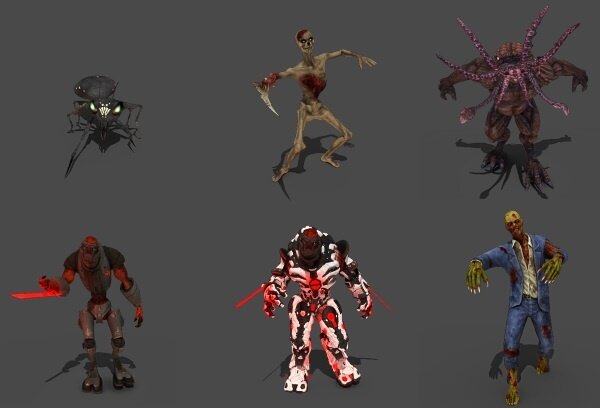 Касательно сюжета, его как такового, здесь нет. Мне хотелось отойти от заурядной темы зомби-БП и сделать в игре дикую мешанину из монстров, мутантов, роботов, пришельцев и т.д. Вот, можете полюбоваться на варианты противников (тоже будем постепенно добавлять):