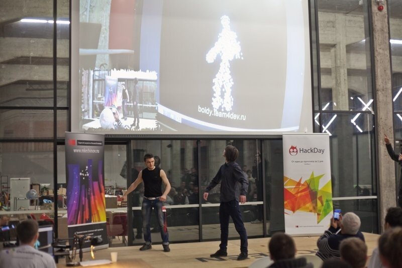 Первый хакатон был организован компанией Microsoft и проходил в Москве. Мы с ребятами абсолютно не знали чего делать — положили в рюкзаки два геймпада от икс бокса и кинект, и решили попробовать сделать игру, в которую можно будет играть с помощью разных средств управления одновременно. Будучи математиками по образованию и по натуре, мы решили забабахать арт инсталляцию, которая симпатично бы смотрелась с минимальным артом. За основу был взят алгоритм движения больших стай птиц. Мы привязали этих птиц к положению игрока перед кинектом и получилось так, что человек состоял из большого количества птичек, которые на первый взгляд, хаотично передвигались внутри его тела. Для игроков, которые играли с помощью джойстиков — дали возможность выстреливать стаями птиц другого цвета и заменять ими птичек внутри тела основного игрока. Получилось эффектно(учитываю, что делали меньше суток) — видос ниже: