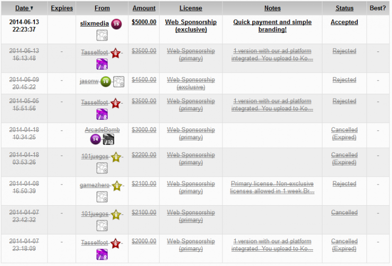Внезапно, в начале июня, пришла новая ставка 4500$ от MaxGames за эксклюзив. Конечно 3500$ и 4500$ были не теми суммами, на которые я рассчитывал. Но вестей от Кайла все не было, ждать сильно надоело и я запустил Last call. Во время ласткола я продолжал спамить спонсоров, торговался с Тассом и писал Jason'у из MaxGames, но ответа от него так и не получил. Была куча просмотров, но новых ставок не поступало. Удалось только уломать Тасса оплатить комиссию FGL.