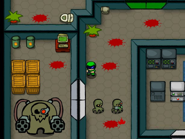 С этой игрой связан технологический скачок! :) Это моя первая игра со скроллом экрана и динамически изменяющимся уровнем. Стены разрушаются, открывая новые проходы, двери открываются и закрываются, бочки ломаются, пятна крови рендерятся на пол. А какой великолепный ИИ! Мобы не просто прут на игрока, а ещё могут обходить простейшие препятствия, в виде стен и других мобов. :) А движок тот же самый — FlashPunk.