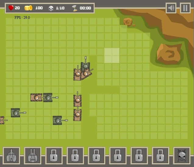 И тут я столкнулся с оптимизацией. Т.к. у меня вместо вейпоинтов используется поиск пути, а в каждой волне 20 крипов, когда построили пушку — всем им нужно было пересчитывать путь и это все подвисало на 1-2 секунды. Можно было сделать для всех один путь, но мне не хотелось что бы они шли веревочкой друг за другом. И тут я начал искать разные алгоритмы поиска пути, но ничего не помогало, 20 раз просчитать путь — вешали игру на 1-2 секунды (старался тестировать на слабой машине). В общем решил проблему так, — у меня в игре 30 кадров в секунду, я решил считать по 1 крипу за кадр и о чудо заработало, лаги пропали (не знаю насколько это верный путь но я пошел по нему).