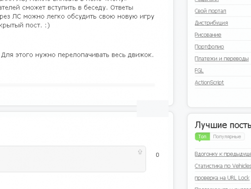 В этом движке необычная и довольно мощная система личных сообщений. При создании ЛС, можно вписать в поле «Кому» несколько человек. Таким образом будет создано обсуждение, где каждый из получателей сможет вступить в беседу. Ответы реализованы через комментирование созданного личного сообщения. Получается через ЛС можно легко обсудить свою новую игру или показать рабочие скриншоты ограниченному кругу людей. Такой своего рода закрытый пост. :)